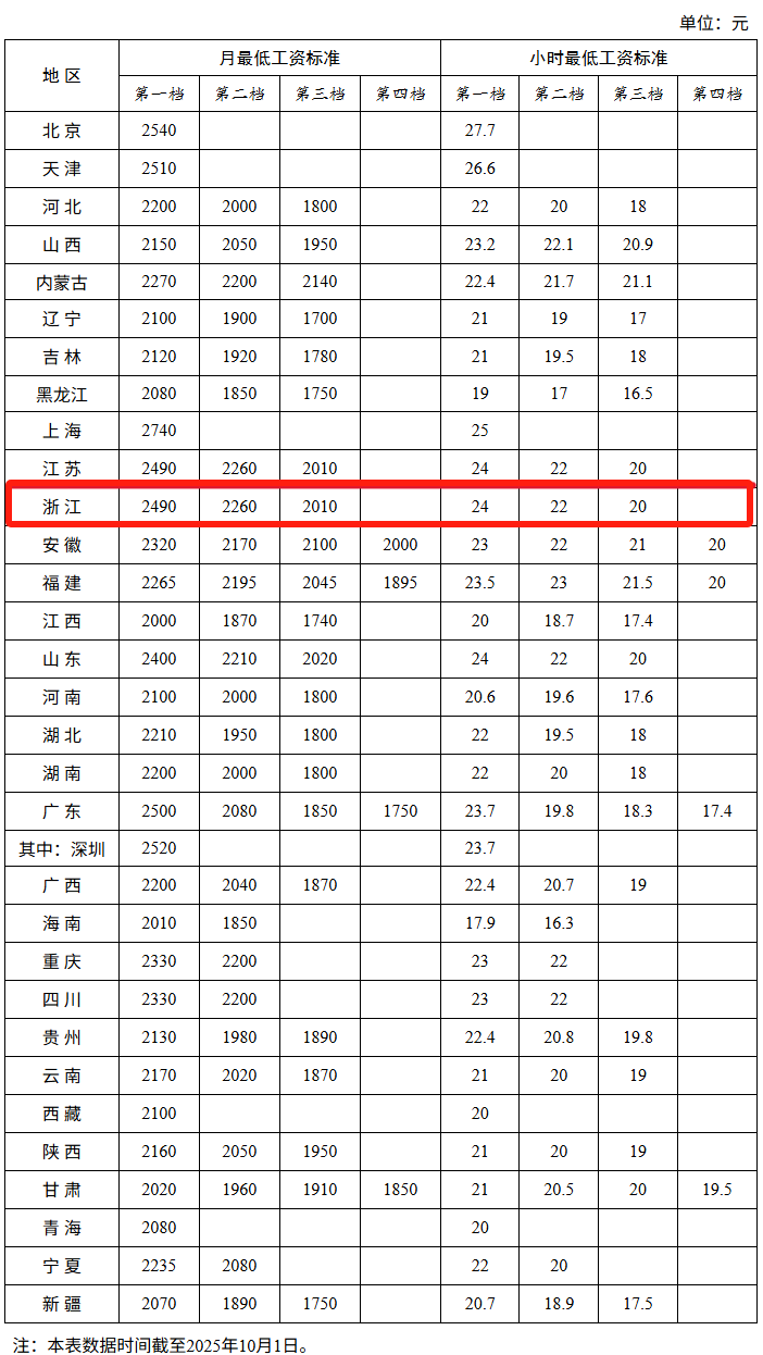 其中,浙江第一档月最低工资标准为2490元,第二档月最低工资标准为2260元,第三档月最低工资标准为2010元;第一档小时最低工资标准为24元,第二档小时最低工资标准为22元,第三档小时最低工资标准为20元。